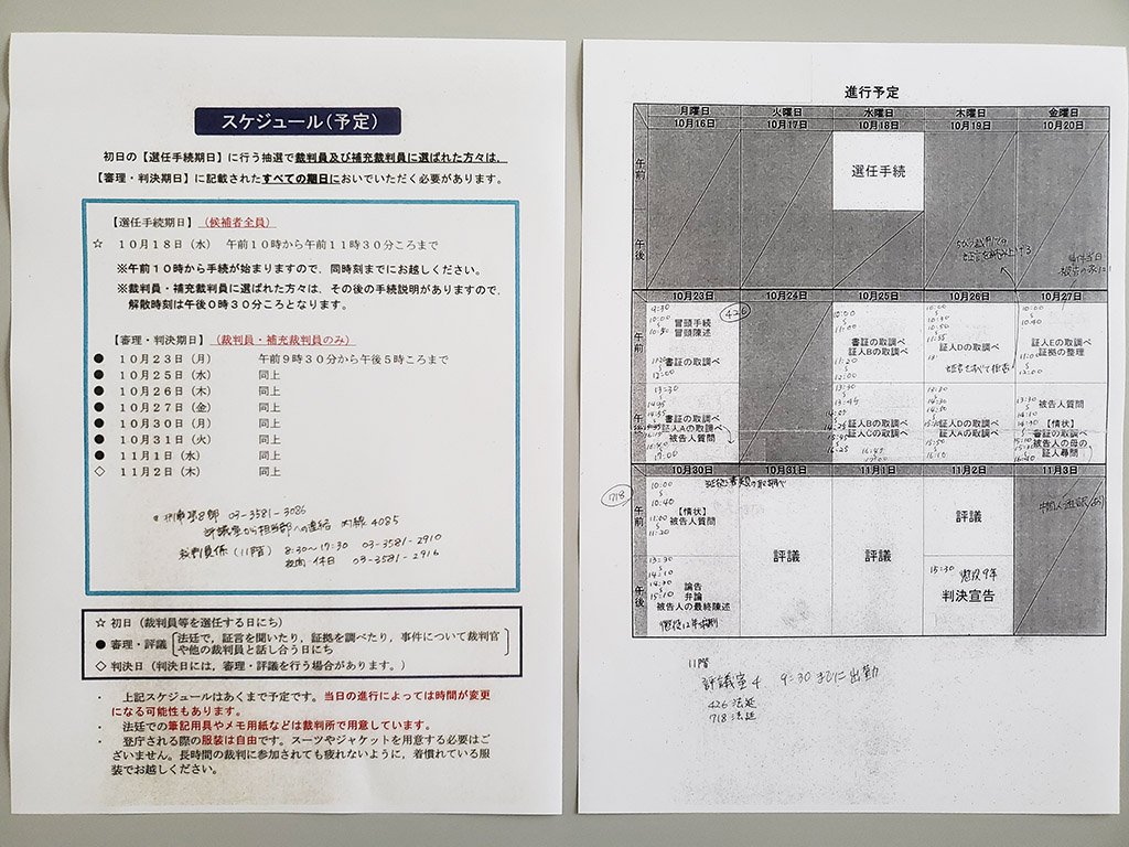 だからか、裁判員の期間中、できるかぎりメモっておこうと思って、もらえる物にコソコソとメモしてました。スケジュール帳にも起きたことをメモしておく感じですね。メモ魔です。