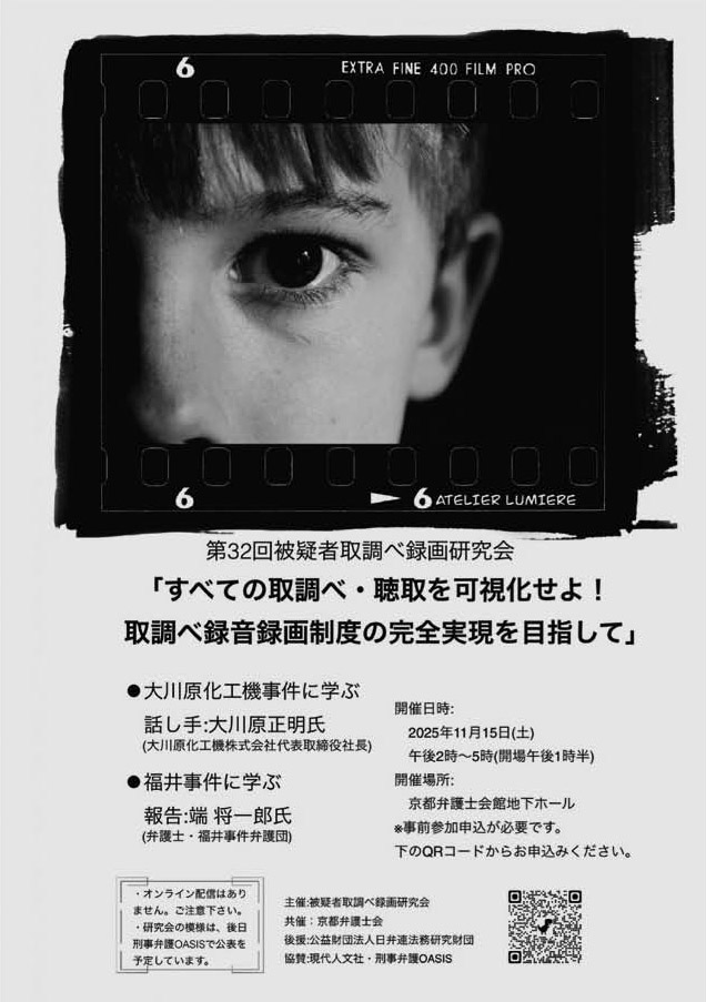 11月15日「被疑者取調べ録画研究会」公開研究会/「すべての取調べ・聴取を可視化せよ! 取調べ録音録画制度の完全実現を目指して」を、京都で開催!