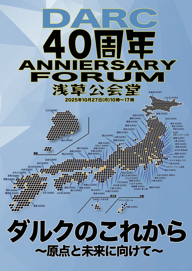 日本のDARC(ダルク)活動40周年を記念し、「ダルクのこれから~原点と未来に向けて~」をテーマとした記念フォーラムが、東京浅草で開催される。