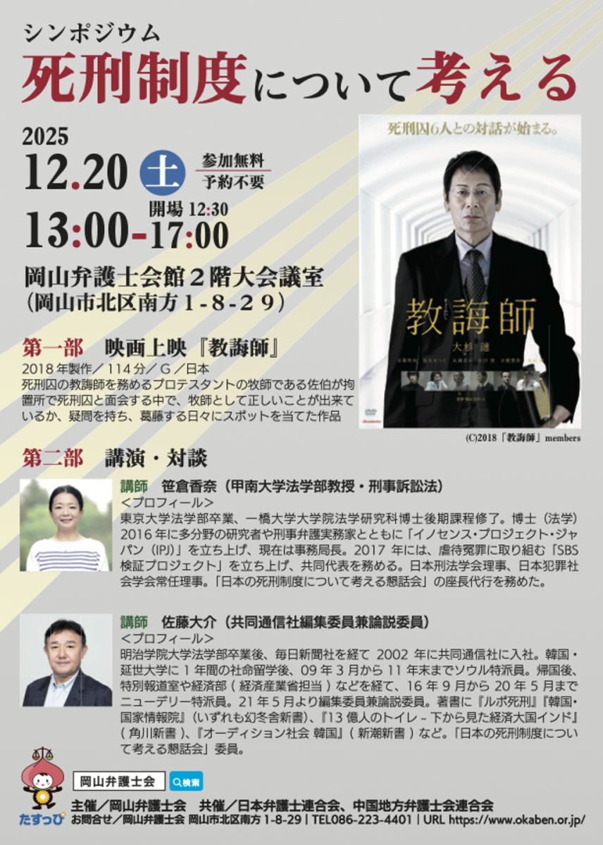 今一度、死刑制度について市民とともに考えるべく、岡山弁護士会がシンポジウムを開催する。