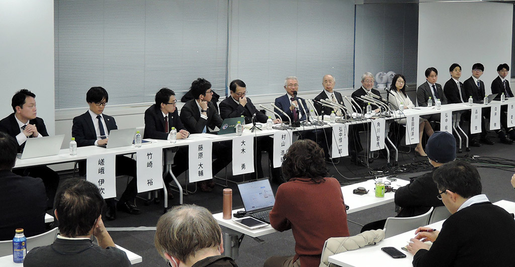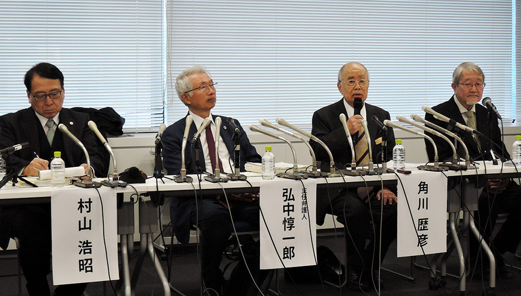 記者会見で判決を非難する角川歴彦氏(右から2人目)と主任弁護人の弘中惇一郎弁護士(同3人目)、村山浩昭弁護士(一番左)(2026年1月22日、東京都千代田区、 撮影/小石勝朗)