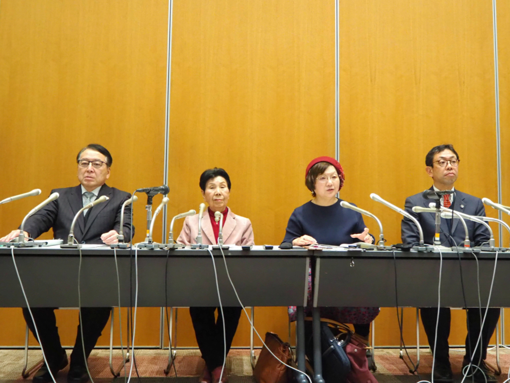 記者会見をする日弁連委員ら──左から、村山浩昭弁護士、袴田ひで子さん、鴨志田祐美弁護士、田岡直博弁護士。(2026年2月2日、東京・霞が関の弁護士会館にて。撮影:刑事弁護オアシス編集部)