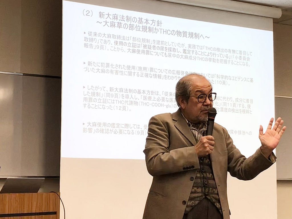2日目の冒頭では、刑事司法未来・弁護士の石塚伸一さんが、大麻取締りの現在について解説した。大麻をとりまく法律は2023年に改定され、これまで大麻使用の処罰規定はなかったところ、施用罪が適用されるようになった(麻薬及び向精神薬取締法27条1項、66条の2)。