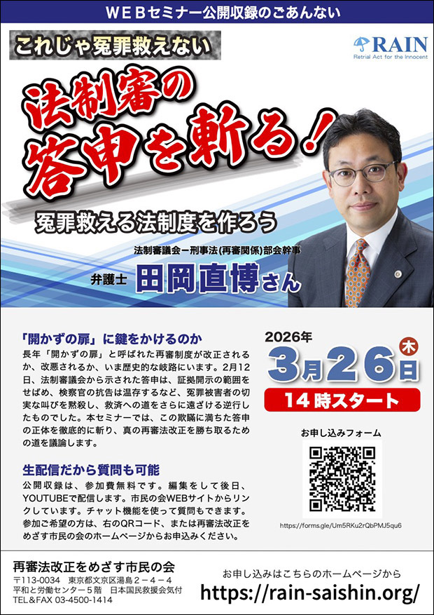 3月26日、 WEBセミナー「これじゃ冤罪救えない 法制審の答申を斬る!」を公開収録、田岡直博弁護士が講演
